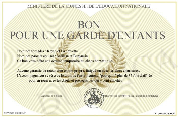 Envoyez par email votre Bon pour une garde d'enfants personalisé