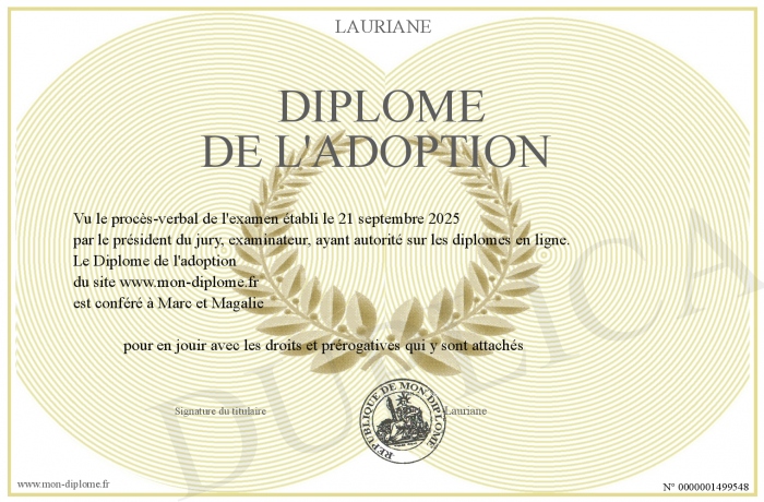 Envoyez par email votre Diplôme de l'adoption personalisé