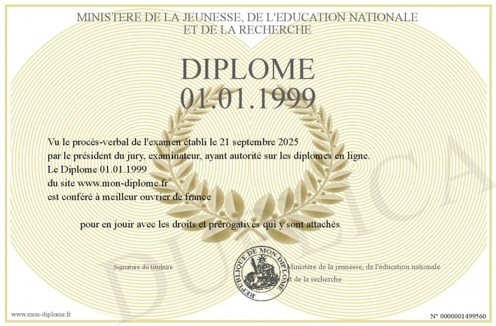 Envoyez par email votre Diplôme 01.01.1999 personalisé