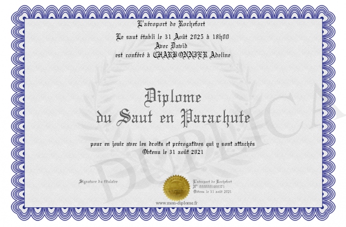 Envoyez par email votre Diplôme du Saut en Parachute personalisé