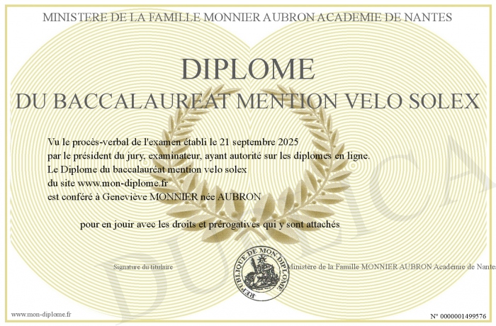 Envoyez par email votre Diplôme du baccalauréat mention velo solex personalisé