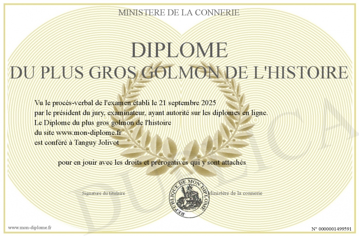 Envoyez par email votre Diplôme du plus gros golmon de l'histoire personalisé