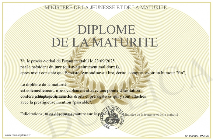 Envoyez par email votre Diplôme de la Maturité personalisé
