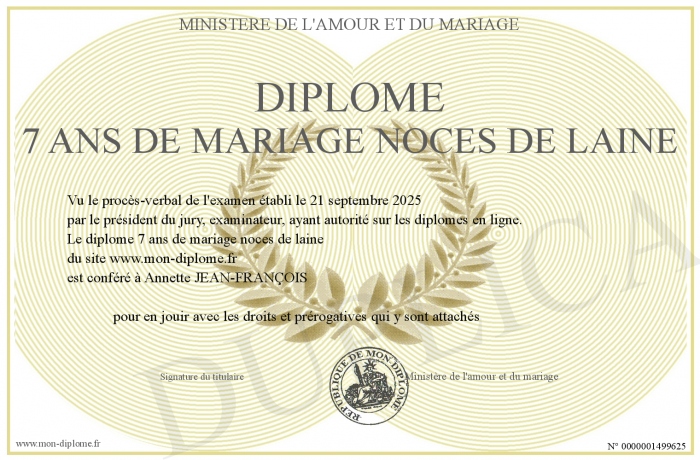 Envoyez par email votre diplôme 7 ans de mariage noces de laine personalisé