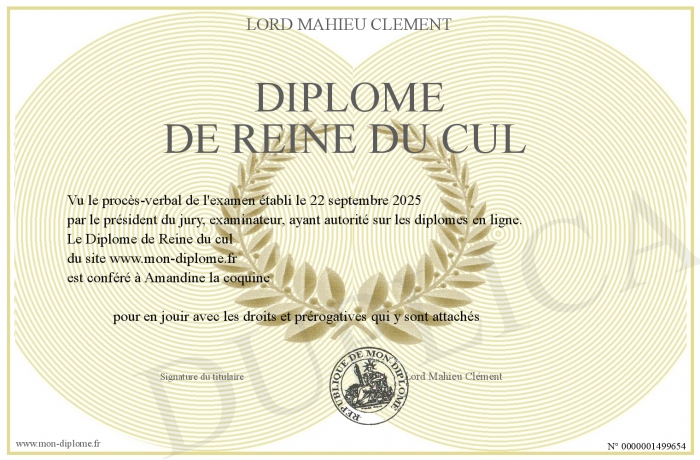 Envoyez par email votre Diplôme de Reine du cul personalisé