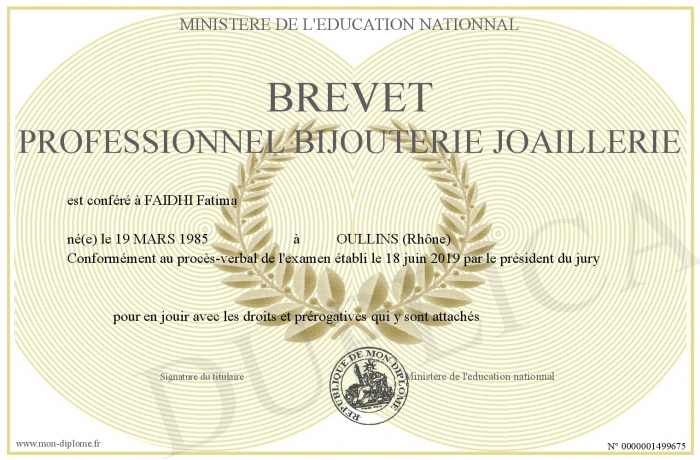 Envoyez par email votre brevet professionnel bijouterie joaillerie personalisé
