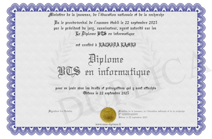 Envoyez par email votre Diplôme BTS en informatique personalisé