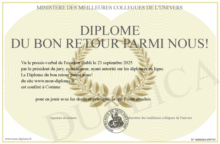 Envoyez par email votre Diplôme du bon retour parmi nous! personalisé