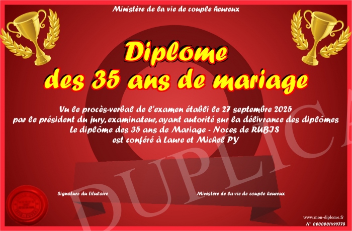 Envoyez par email votre Diplôme des 35 ans de mariage personalisé