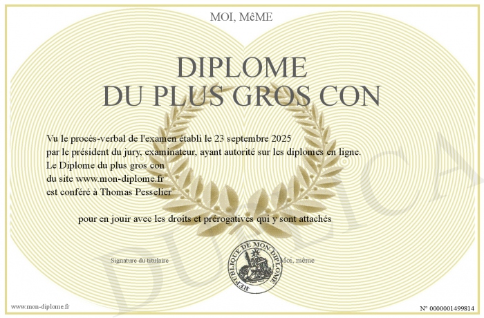 Envoyez par email votre Diplôme du plus gros con personalisé