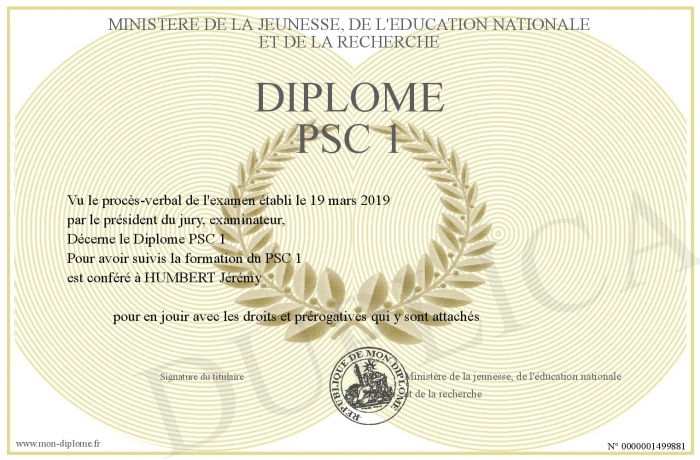 Envoyez par email votre Diplôme PSC 1 personalisé