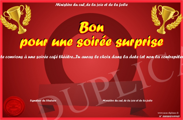 Envoyez par email votre Bon pour une soirée surprise personalisé