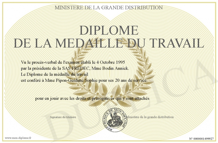 Envoyez par email votre Diplôme de la médaille du travail personalisé
