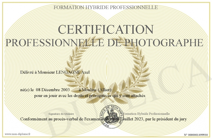 Envoyez par email votre certification professionnelle de Photographe personalisé