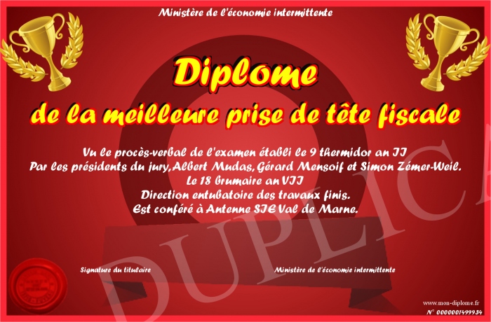 Envoyez par email votre Diplôme de la meilleure prise de tête fiscale personalisé