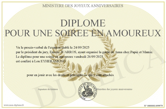 Envoyez par email votre Diplôme pour une soirée en Amoureux personalisé