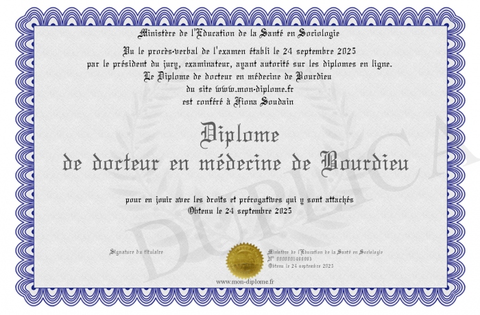 Envoyez par email votre Diplôme de docteur en médecine de Bourdieu personalisé