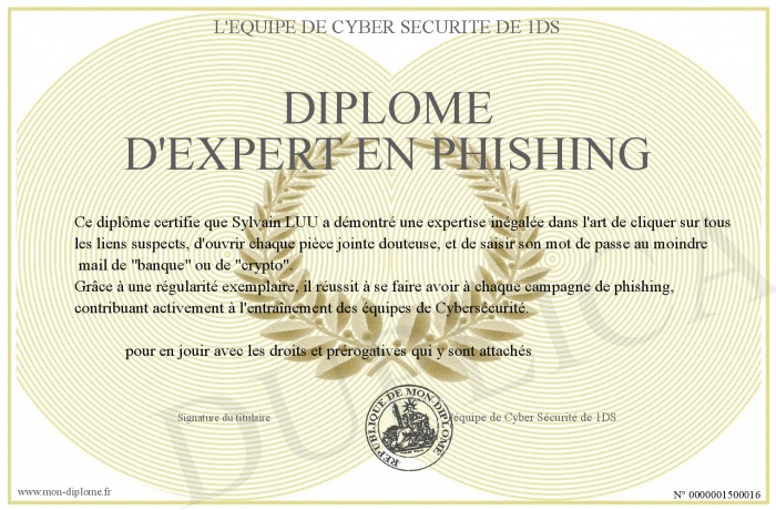 Envoyez par email votre Diplôme d'Expert en Phishing personalisé
