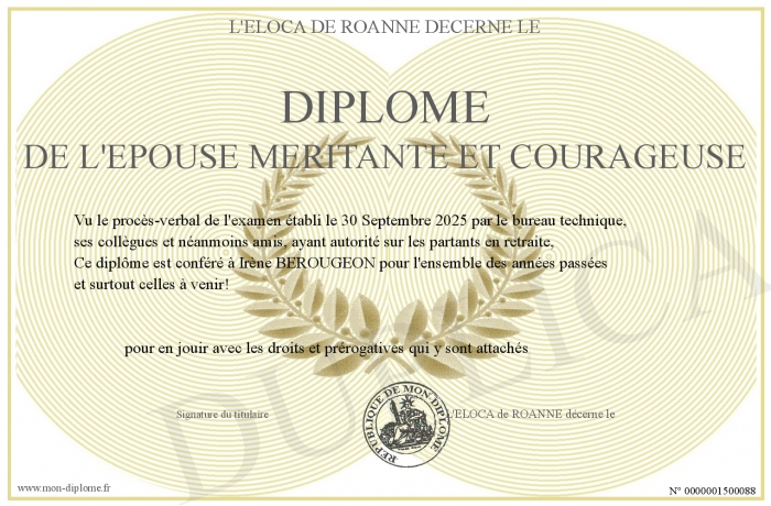 Envoyez par email votre Diplôme de l'épouse méritante et courageuse personalisé