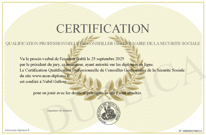 Envoyez par email votre Certification Qualification Professionnelle de Conseiller Gestionnaire de la Sécurité Sociale personalisé