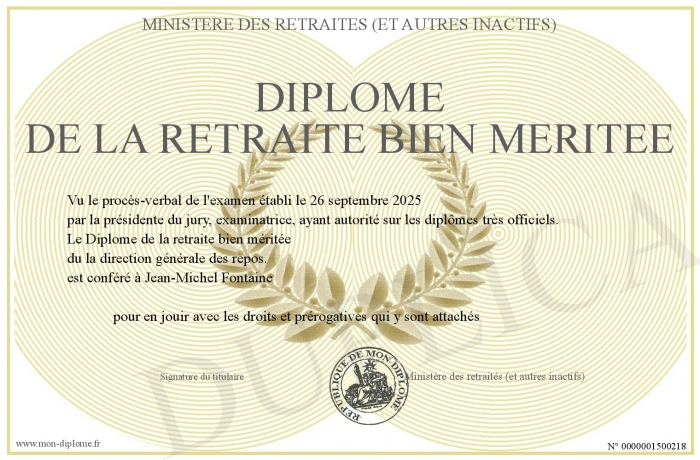 Envoyez par email votre Diplôme de la retraite bien méritée personalisé