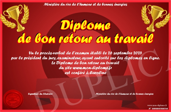 Envoyez par email votre Diplôme de bon retour au travail personalisé