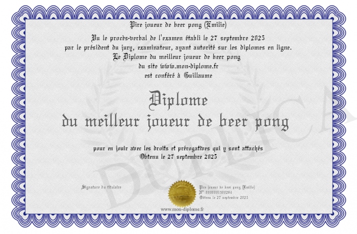 Envoyez par email votre Diplôme du meilleur joueur de beer pong personalisé