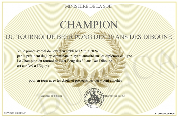 Envoyez par email votre Champion du tournoi de Beer Pong des 30 ans Des Diboune personalisé
