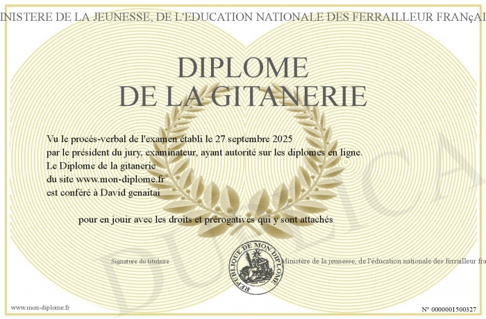 Envoyez par email votre Diplôme de la gitanerie personalisé