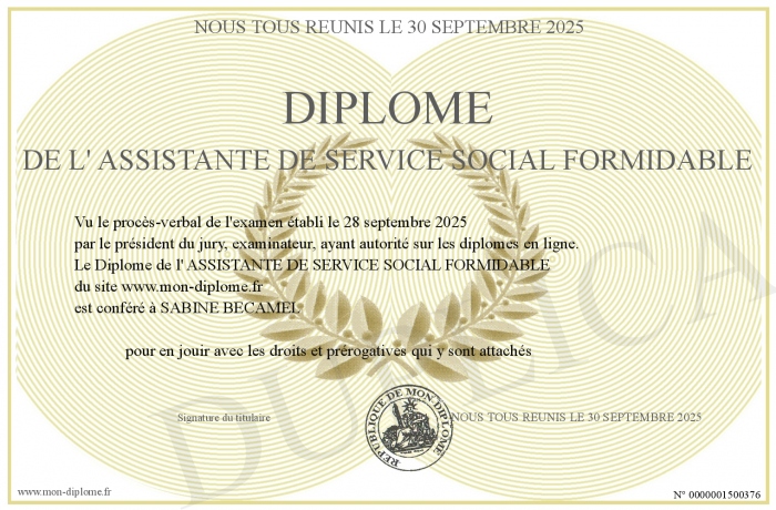 Envoyez par email votre Diplôme de l' ASSISTANTE DE SERVICE SOCIAL FORMIDABLE personalisé