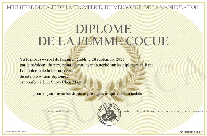 Envoyez par email votre Diplôme de la femme cocue personalisé