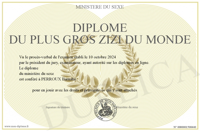 Envoyez par email votre Diplôme du plus gros zizi du monde personalisé