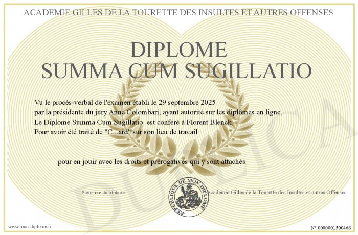 Envoyez par email votre Diplôme Summa Cum Sugillatio personalisé