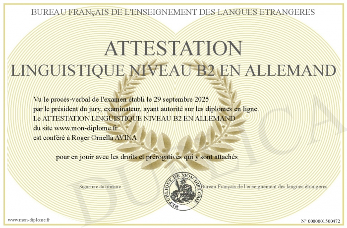 Envoyez par email votre ATTESTATION LINGUISTIQUE NIVEAU B2 EN ALLEMAND personalisé