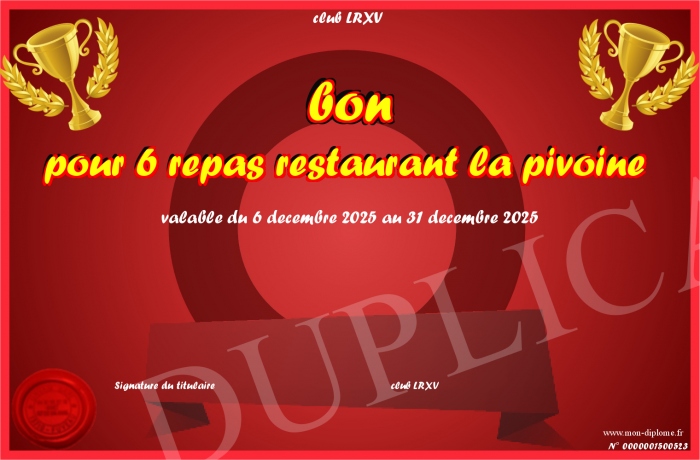 Envoyez par email votre bon pour 6 repas restaurant la pivoine personalisé