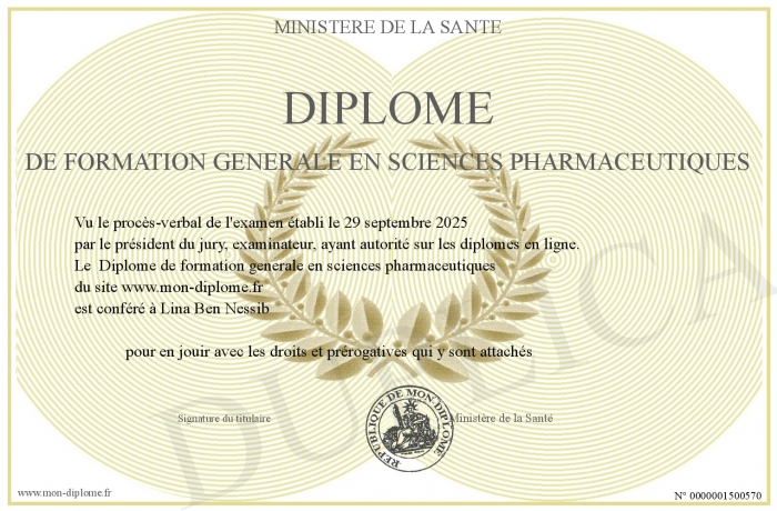 Envoyez par email votre Diplôme de formation generale en sciences pharmaceutiques personalisé