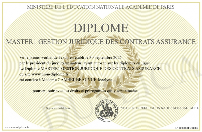 Envoyez par email votre Diplôme MASTER1 GESTION JURIDIQUE DES CONTRATS ASSURANCE personalisé