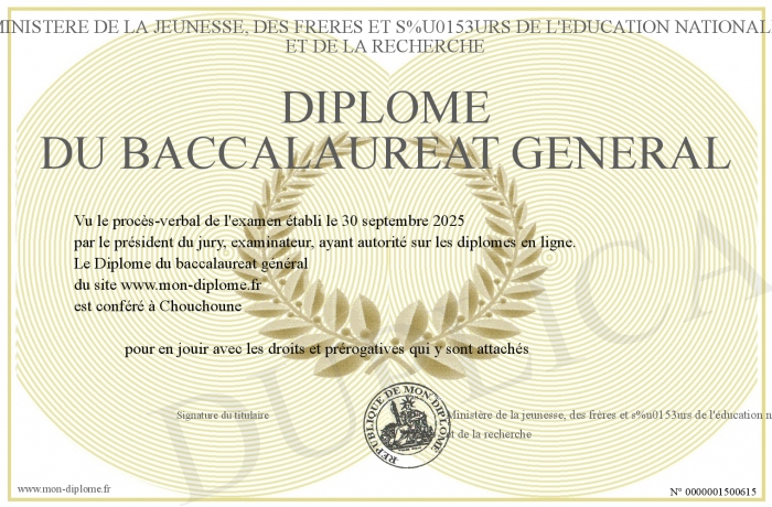 Envoyez par email votre Diplôme du baccalaureat général personalisé