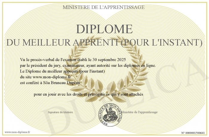 Envoyez par email votre Diplôme du meilleur apprenti (pour l'instant) personalisé