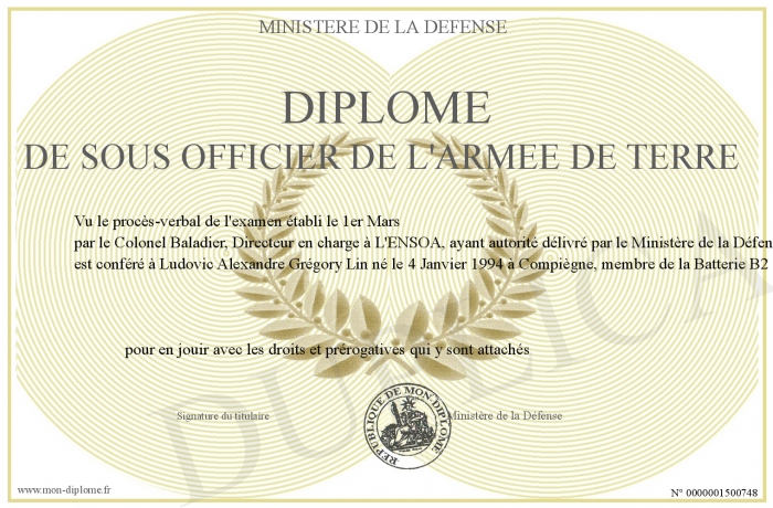 Envoyez par email votre Diplôme de sous Officier de l'Armée de Terre personalisé