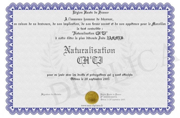 Envoyez par email votre Naturalisation CH'TI personalisé