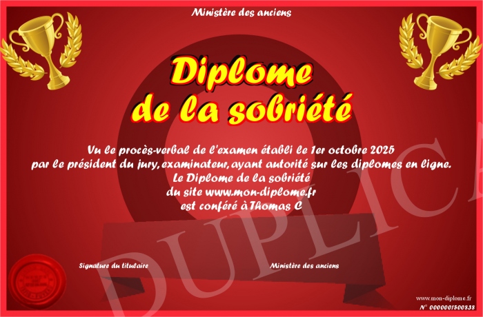 Envoyez par email votre Diplôme de la sobriété personalisé