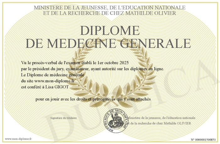 Envoyez par email votre Diplôme de médecine générale personalisé