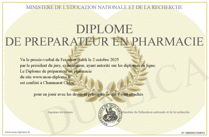 Envoyez par email votre Diplôme de préparateur en pharmacie personalisé