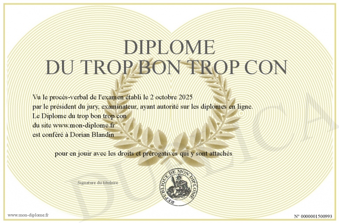 Envoyez par email votre Diplôme du trop bon trop con personalisé