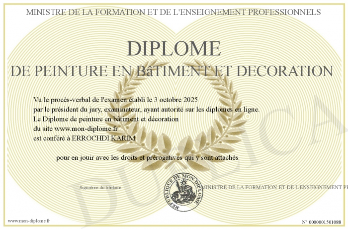 Envoyez par email votre Diplôme de peinture en bâtiment et décoration personalisé