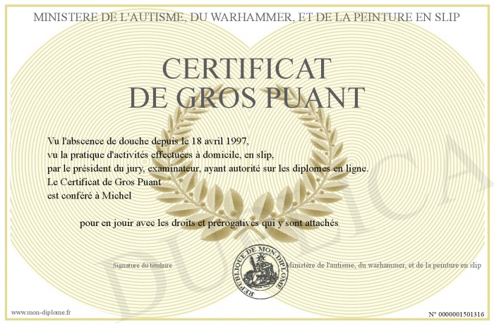 Envoyez par email votre Certificat de Gros Puant personalisé