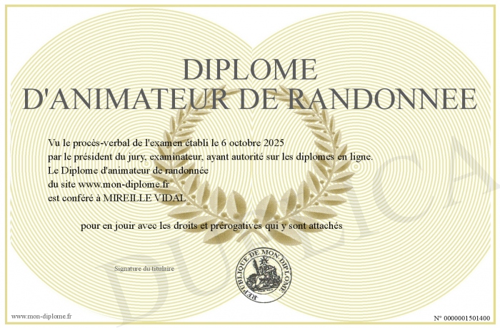 Envoyez par email votre Diplôme d'animateur de randonnée personalisé