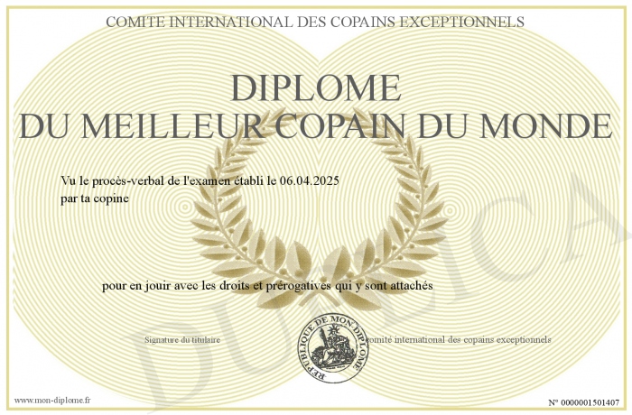 Envoyez par email votre Diplôme du meilleur copain du monde personalisé