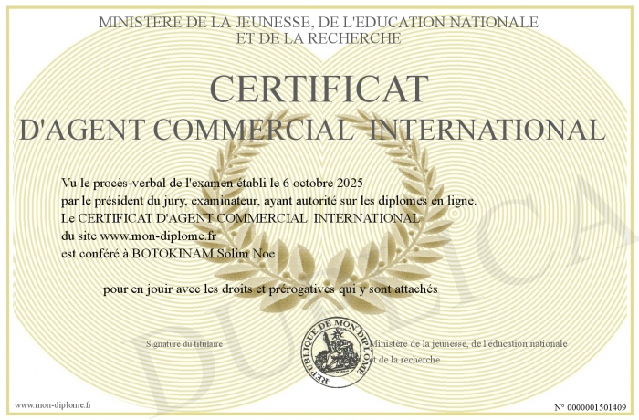 Envoyez par email votre CERTIFICAT D'AGENT COMMERCIAL INTERNATIONAL personalisé